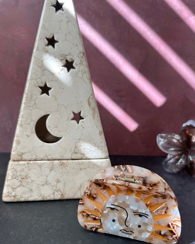 Bring a touch of golden warmth to your hair with this neutral sun claw clip! Its earthy tones and sunburst design add a natural, radiant glow to any look, while the sturdy grip keeps your hair effortlessly in place.